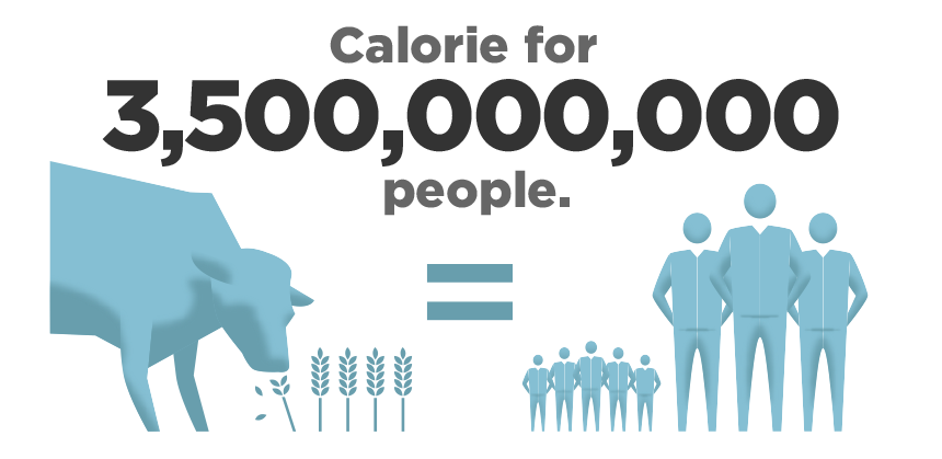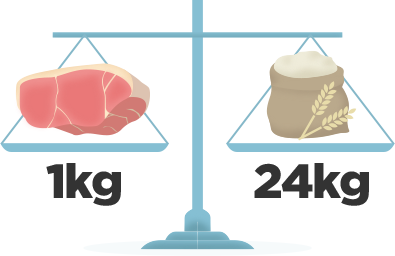 Currently, 36% (by calories) of the global crop yield is consumed as animal feed. In addition, nearly 70% of the global arable land is used for animal agriculture one way or another. Production of 1kg of beef consumes 24 kg of feed crops and tens of thousands of liters of water. The impact on the global environment is huge, especially on the amount of natural resources required.