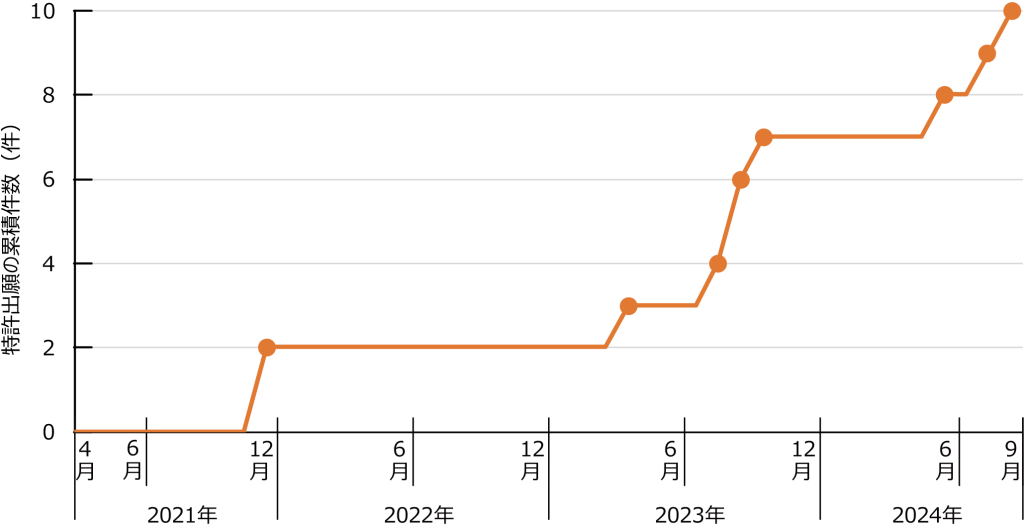 コンソーシアムでは、参画企業様の高い技術力を活かしていただきながら、細胞農業における技術的な課題の解決に向けて、実効性のある形で協業を進めてまいりました。その結果、コンソーシアムの発足からわずか4年目で、細胞農業分野における特許出願数が10件(予定を含む)に達し、今後のさらなる開発が期待されております(図2)。