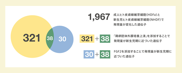 成人ヒト皮膚線維芽細胞(HDFa)に、それぞれ「ニワトリ卵胚体外膜培養上清」、もしくはFGF2(線維芽細胞成長因子|FibroblastGrowth Factor2)を添加したところ、「ニワトリ卵胚体外膜培養上清」添加細胞では359、FGF2添加細胞では68の遺伝子について、新生児ヒト皮膚線維芽細胞(NHDF)での遺伝子発現と近いパターンを示していることがわかりました。このことから、FGF2添加に対して「ニワトリ卵胚体外膜細胞順化培養液」添加の方が約5倍の数の遺伝子を新生児期の遺伝子発現パターンに近づけ、肌状態をより新生児期の状態に近づける可能性が示されました(図1)。