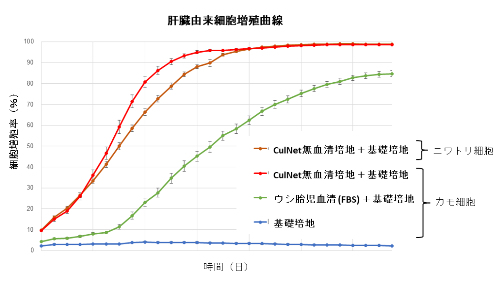 ある臓器細胞の組み合わせで製造したカルネット無血清培地を用いると、動物血清を用いた培地 (ウシ胎児血清を10%含んだ基礎培地) よりも肝臓由来細胞の増殖が速いことが分かりました (図2、図3) 。その速さは1.5〜2.5倍であり、この結果から肝臓由来細胞を増やすには、カルネット システムを使用することで、動物血清が不要であることがわかります。また、従来よりも短期間で細胞を増やすことが可能になるため、商用生産において生産効率の向上、および大幅なコスト削減につながることが期待されます(図3)。