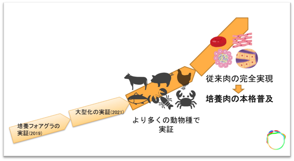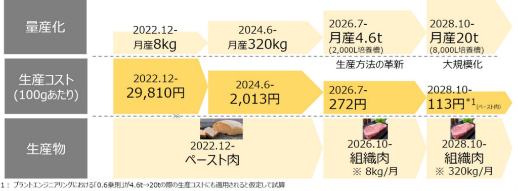 2022年12月時点では、月産8キロ、100グラムあたり約3万円で培養肉の生産が可能となる見込みです。今後、設備の大型化や開発などを進め、2028年後半には、月産20トン、100グラムあたり100円近くでの培養肉の生産を目指します。また、現在の培養肉はペースト状ですが、2026年後半には、ステーキ肉のようなかたまりの肉(組織肉)の実現を技術開発目標としています。