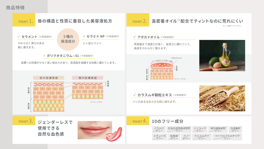 製品を通じて、セルアグの可能性を幅広い層に知ってもらうきっかけにしたいと考え、年齢や性別に問わず使用できるジェンダーレスリップの開発に至りました。商品の売上の一部は、培養肉などの細胞農業の研究開発のための資金に充てられます。
