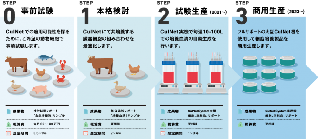 具体的な進め方は、まず弊社にて半年~1年程度の小規模な事前試験を行い可能性を判断頂いた上で、本格研究を実施、最終的にはCulNet Systemを用いた細胞培養製品の生産を目指します。また、受託研究はStep毎に分かれており、都度継続の判断が可能になっております。既に大手食肉メーカー様を含む複数社様の受託研究を開始しております。