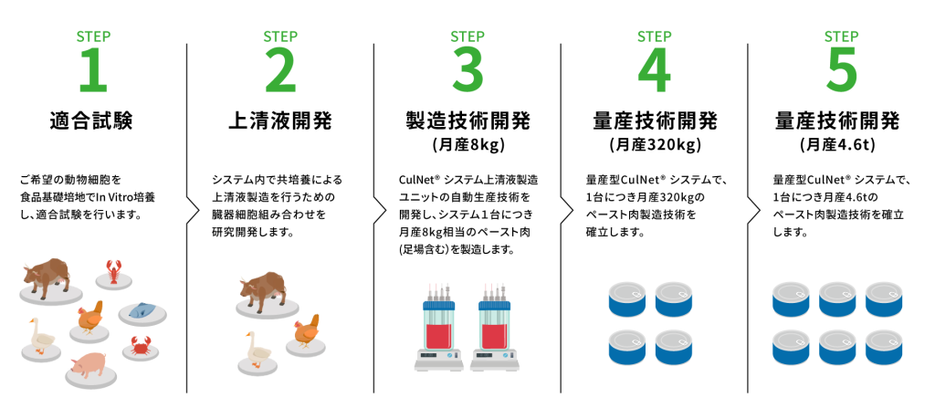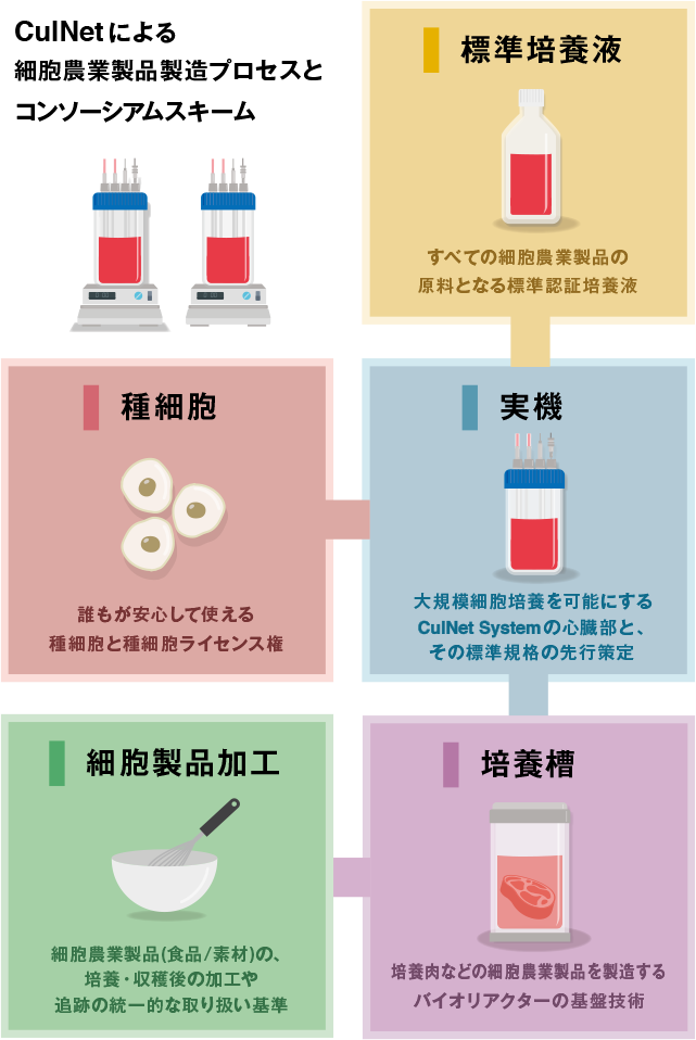 細胞農業統一基盤「Uni-CulNet(ユニ カルネット)」は、CulNet systemを細胞培養の基本インフラとしてご提供し、細胞培養が国内外に広く普及することを目指す構想です。
